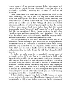 What are the advantages of being an introvert? They make up at least one-third of the people we know. They are the ones who prefer listening to speaking; who innovate and create but dislike self-promotion; who favor working on their own over working in teams. It is to introverts—Rosa Parks, Chopin, Dr. Seuss, Steve Wozniak—that we owe many of the great contributions to society.