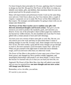 In The Power of One More, renowned keynote speaker and performance expert Ed Mylett draws on thirty years of experience as an entrepreneur and coach to top athletes, entertainers, and business executives to reveal powerful strategies to help you live an extraordinary “one more” life.