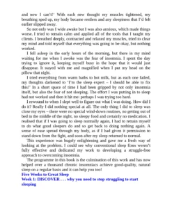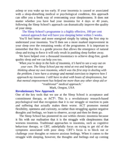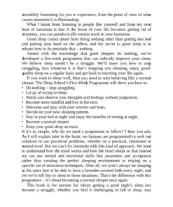 Say Goodbye to Insomnia – The highly Effective 5 Week, Drug-free Plan Sleep shouldn’t be a struggle, but for a third of the population the nightly pattern of tossing, turning and that gnawing frustration is a regular occurrence. The Sleep Book’s revolutionary five week plan now means that this will be a thing of the past. Using a blend of mindfulness and new Acceptance and Commitment Therapy (ACT) techniques, Dr Guy shares his unique fiveweek plan to cure your problems whether it’s a few restless nights or a lifetime of insomnia. Most people who have trouble sleeping invest a huge amount of time, effort and money into fixing the problem. Dr Guy has discovered the secret lies not in what you do, but what you learn not to do. . . . as the more frustrated you become with sleeplessness the further sleep is pushed away. Dr Guy’s pioneering methods at The Sleep School clinic have been an unprecedented success. By popular demand, his highly effective and 100% natural insomnia remedy is now here in this book. Say goodbye to the vicious cycle of sleepless nights by retraining your brain to sleep. Sleep well and restore the quality of life you deserve – for good.